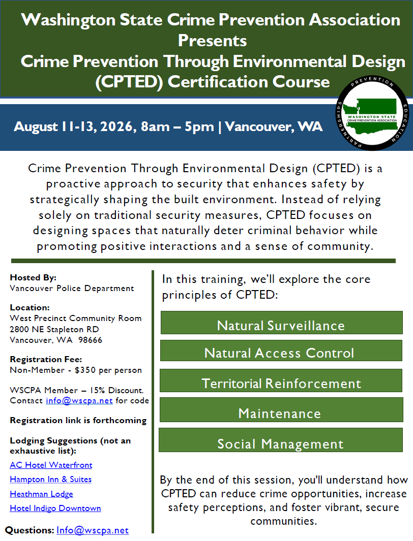 ​Join us for an in-depth Crime Prevention Through Environmental Design (CPTED) training course. Upon completion of this training, you will be certified by the Washington State Crime Prevention Association as a CPTED-Trained Professional.